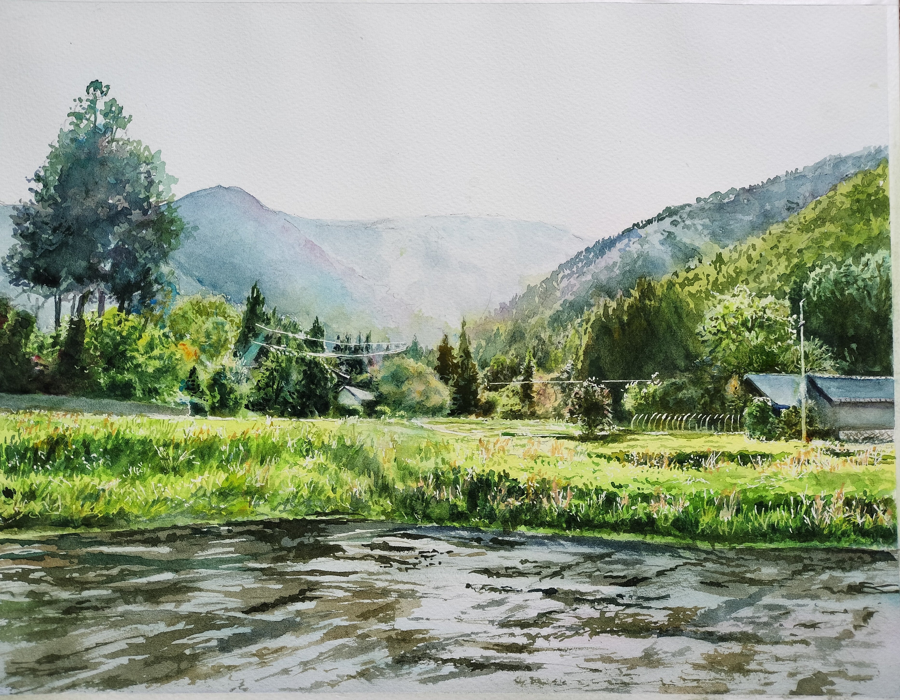 夕刻を迎える谷間から差し込む光、その光が麓まで照らす景色を描きました