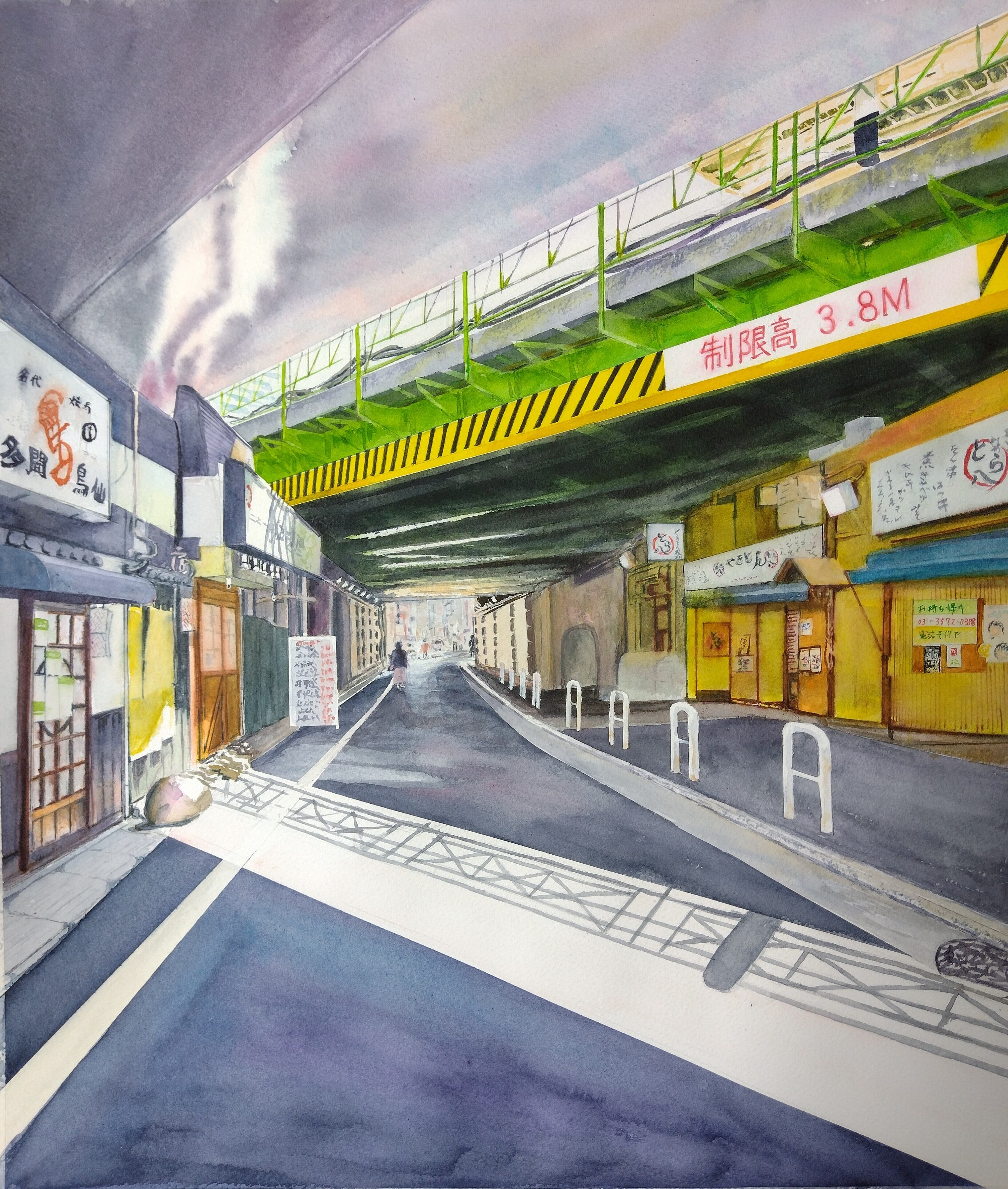 高架線路の隙間から太陽の位置と合った時にだけ差し込む光が路地裏を明るく照らした風景を描きました