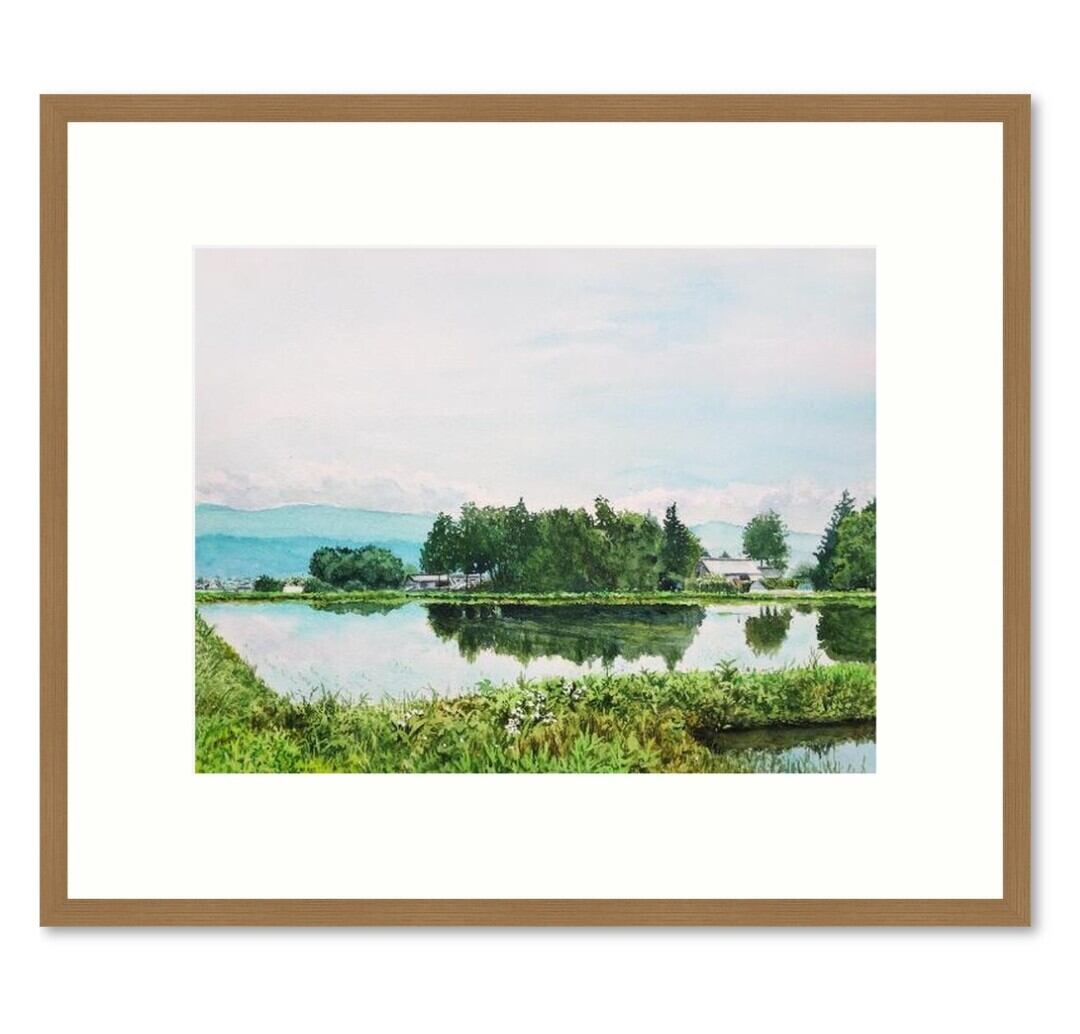 水彩画 F6横(31cm×41cm)※額装込み ※送料込み 2023年作 苗が植えられたばかりの田はまだ水鏡に近く周りの景色と空が一面に映り込んでいました