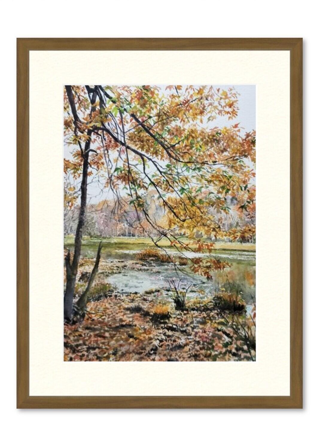 縦21cmx横30cm ※額装込み ※送料込み 2023年作 山の上にある沼はすでに紅葉も終わりかけており周りの秋色の景色に見とれて眺めていました